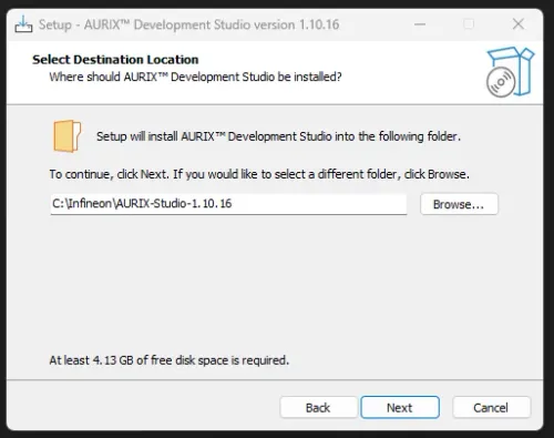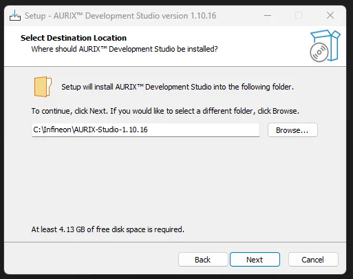 By default, the IDE will be installed to C:\Infineon, e.g. C:\Infineon\AURIX-Studio-1.10.16.