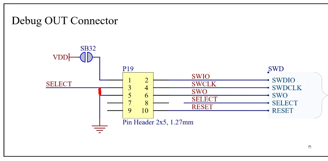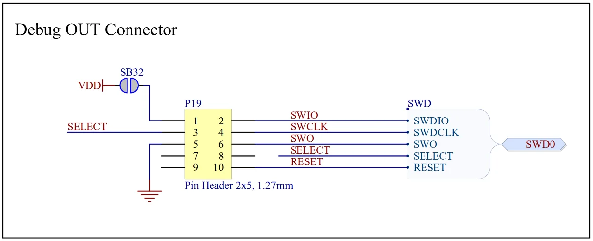 To do this, you plug the development kit into the host computer using a USB cable. You then connect the development kit to the target device using the Debug OUT connector, which is a standard 2x5 1.27mm pitch header. It follows the standard ARM SWD pinout. The schematic from the nRF52-DK (it should be either the same or very similar on other development kits) is shown in This is a placeholder for the reference: fig-debug-out-connector-schematic-on-nrf52-dk.