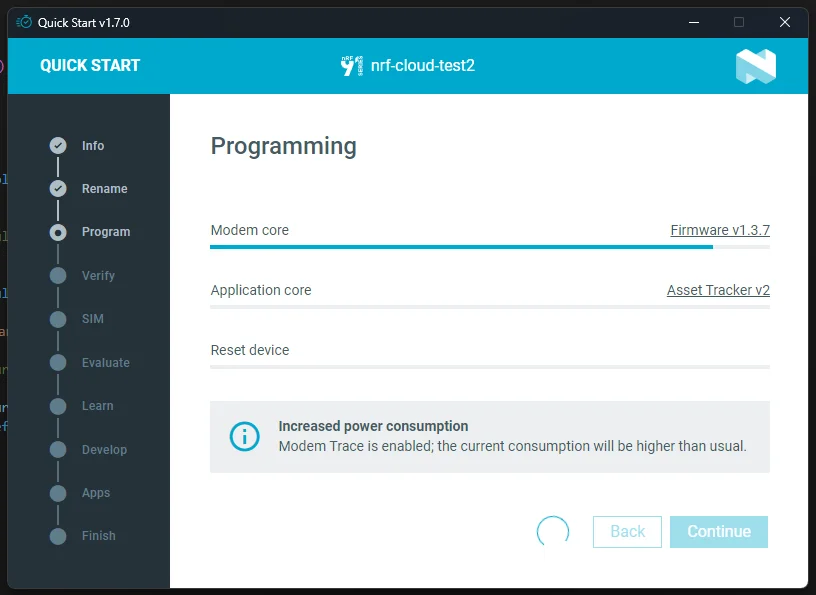 The “Quick Start” tool can also be used to program nRF SoCs, but is only designed to program development kits with example projects.
