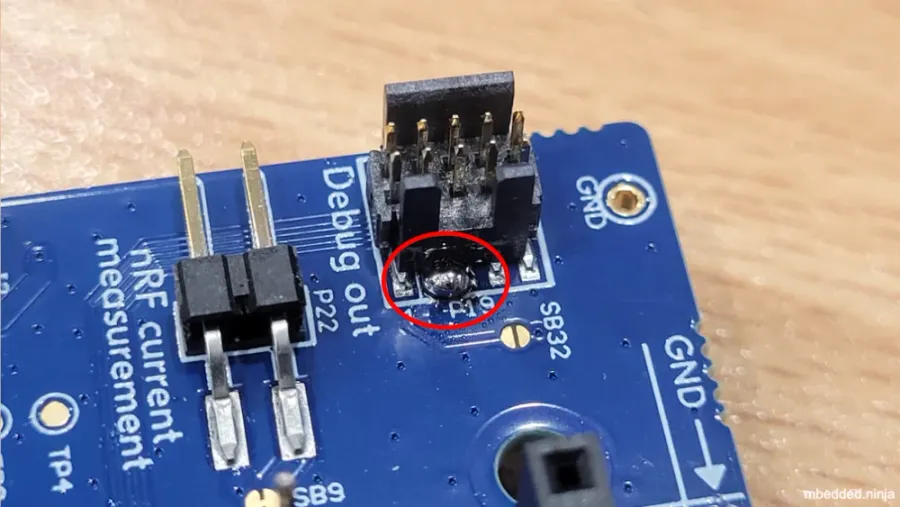 Luckily, there is a GND pin adjacent to the SELECT pin on the SMD header, at it is easy to short them together with a small solder blob, as shown in This is a placeholder for the reference: fig-shorting-select-to-gnd-on-nrf52-dk-photo.
