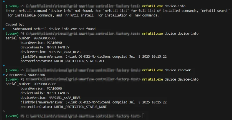 $ nrfutil device device-infoserial_number: 000960036306 boardVersion: PCA10090 deviceFamily: NRF91_FAMILY deviceVersion: NRF9151_xxAA_REV3 jlinkObFirmwareVersion: J-Link OB-K22-NordicSemi compiled Jul 8 2025 10:15:22 protectionStatus: NRFDL_PROTECTION_STATUS_NONEThis lists things such as the MCU device family (and version, which is like the family, but more specific) and the protection status.