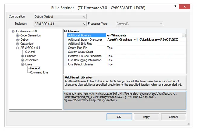 Make sure you add the emWin link library (emWinnosnts.lib, emWinnosts.lib or similar) to the linker, otherwise you will get unresolved reference errors, even if you’ve added all of the .c and .h files to the project. This is not an obvious step! These are added by navigating to Build Settings->Linker->Additional Link Files in PSoC Creator.