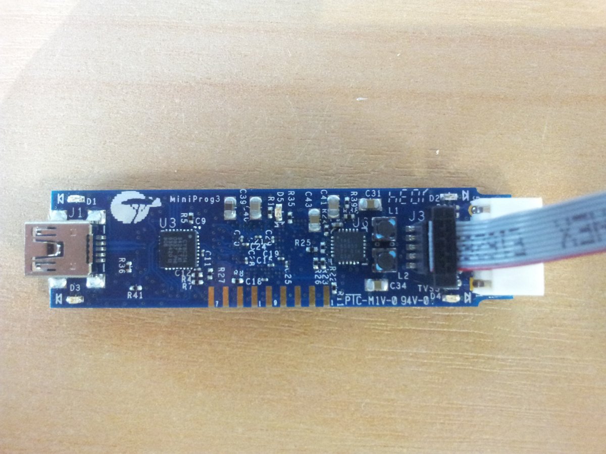 Programming is supported by the MiniProg programmers. The current version is the MiniProg 3 which supports JTAG, SWD, ISSP, SWV and I2C (in a bridge, not programming protocol). It can program target boards with a voltage ranging from 1.5 to 5.5V, or supply power to the target board at one of four voltage levels. It comes with both a 5-pin 100mil pitch and 10-pin 50mill pitch header. The 10-pin connector is used on the prototyping boards, and a cable is provided. The programmer is small! (which is a good thing). Some (e.g. ATMEL’s) are huge, and also quite expensive in comparison (especially for the ATMEL JTAG programmer).