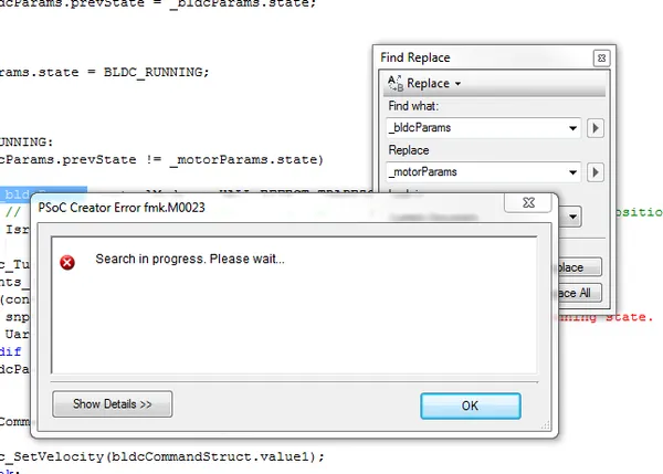 When using Find/Replace in PSoC Creator, you will notice that the search resets itself if you edit any text while doing a stepwise search. This becomes really annoying, because every time it resets, you end up iteration through all the previously found strings before searching for any new ones.