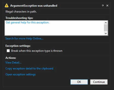 Sometimes PSoC Creator crashes when running the debugger. If I investigate the exception using Visual Studio, the exception I see is caused by “Invalid characters in path”.