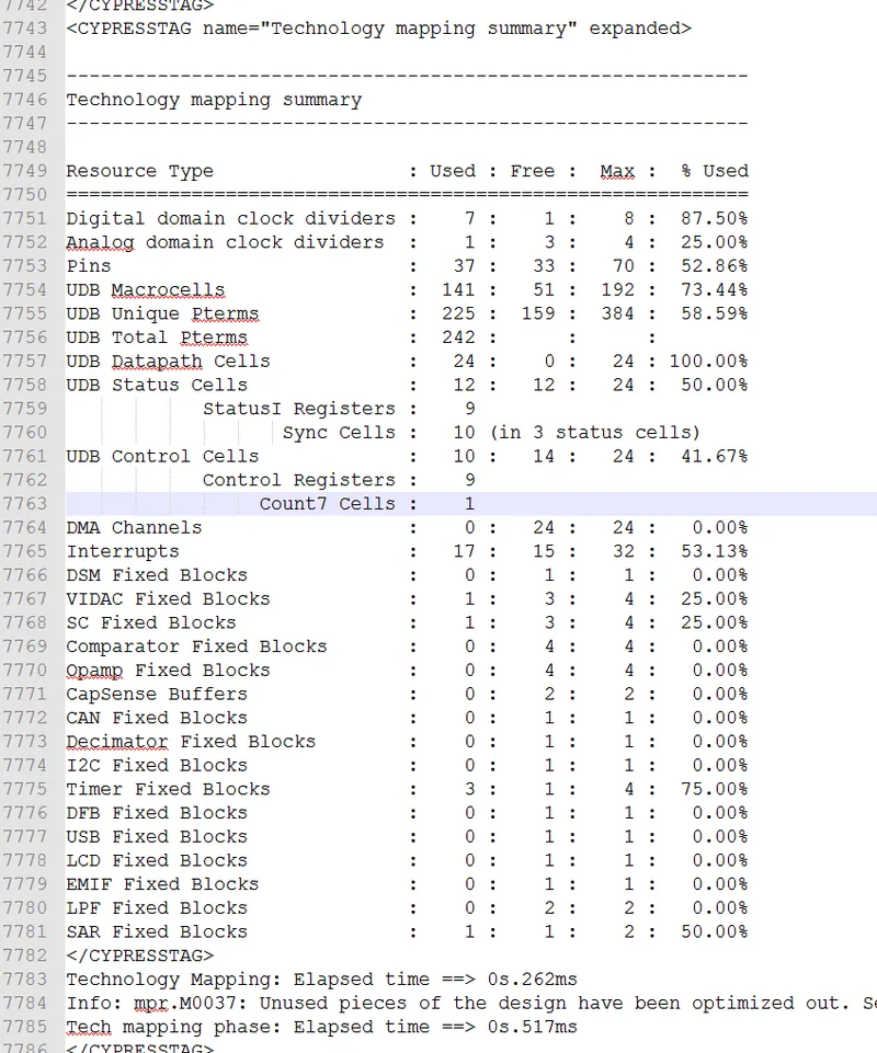 As shown in the image below, the table shows you useful things like how many of the following you are using: UDB Macrocells and Datapath Cells, analog and digital clock dividers, DMA channels, interrupts and pins.