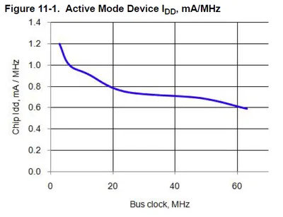 As with almost all digital electronics, as the clock speed increases, so does the power consumption. However, this does not neccesarily mean that you save power by running at a faster clock speed. You have to consider that at faster clock speeds, you get the ‘job’ done faster, meaning the processor is consuming power for less time. In fact, at faster clock speeds, the mA per MHz actually decreases, as shown by the following graph.