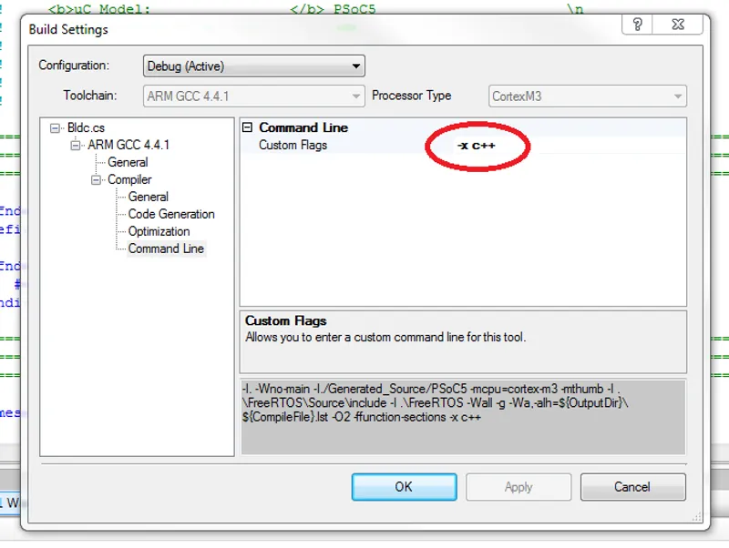 I have also experimented with building with the C++ compiler/linker directly (as opposed to the -c c++ method). Why would we want to do this? There are differences between building with the GCC compiler and -x c++ compared to building directly with arm-none-eabi-g++.exe. I believe most of the differences (if not all) are because in the first case, the C-linker is used, while in the latter case, the C++-linker is used. Without using the C++ linker, we can’t use virtual methods or exceptions in our code (note: all PSoC code with exceptions compiles fine with G++, I haven’t got it to actually work without crashing a PSoC microcontroller yet).