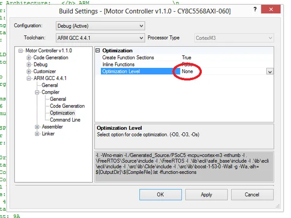 C++ code can be debugged using the MiniProg3 and the in-built debugging facilities in the PSoC Creator IDE, as long as code optimisation is turned off. Optimisation is turned off in the build settings for the project, as shown in the image below.