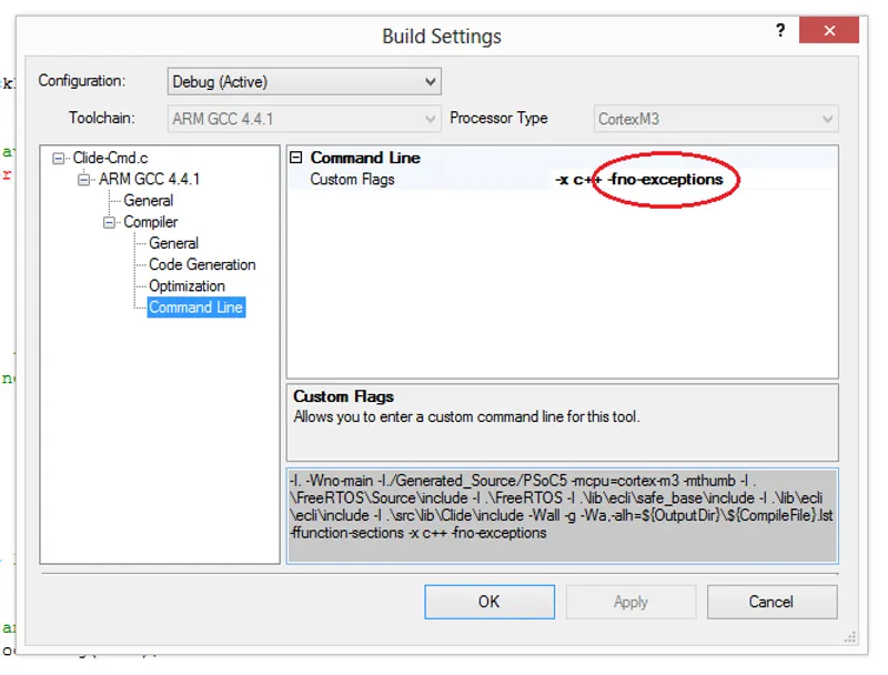 To prevent this, you have the to include the build flag -fno-exceptions to every .cpp file that produces this error. To add the build flag to a particular file, right click the file in the Workspace Explorer and click “Build Settings”. Then click “compilers”, then “Command Line”, and enter -fno-excpetions to the “Custom Flags” field.