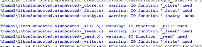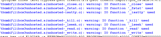 You can safely ignore the warning: IO function 'xxx' used messages that pop up while compiling (xxx tends to be _close, _fstat, _isatty, _kill, _lseek, _read, and _write). I don’t know exactly what these do, but the programs seem to work fine even though they are used.