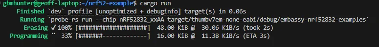 gbmhunter@geoff-laptop:~/nrf52-example$ probe-rs listThe following debug probes were found:[0]: J-Link -- 1366:1051:001050376416 (J-Link)Flashing the nRF52 DK
