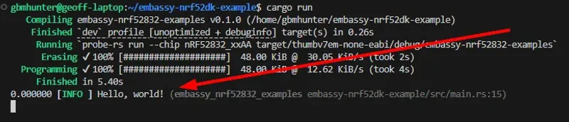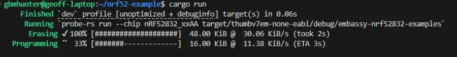 Now that we have attached the debugger, we can now flash the nRF52 DK using cargo run: