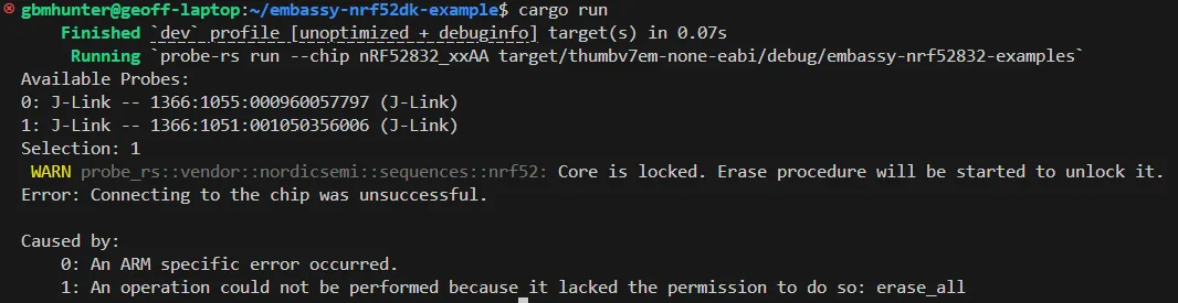 Caused by: 0: An ARM specific error occurred. 1: An operation could not be performed because it lacked the permission to do so: erase_allI managed to fix this by adding the flag --allow-erase-all to the probe-rs run command in the .cargo/config.toml file.