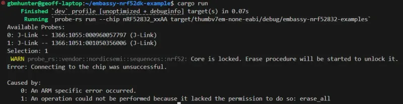 WARN probe_rs::vendor::nordicsemi::sequences::nrf52: Core is locked. Erase procedure will be started to unlock it.Error: Connecting to the chip was unsuccessful.