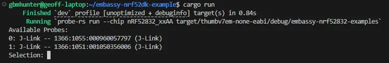 cargo runIf you have multiple debuggers attached, probe-rs will ask you to select which one to use.