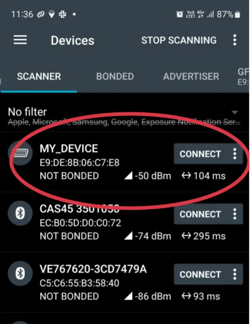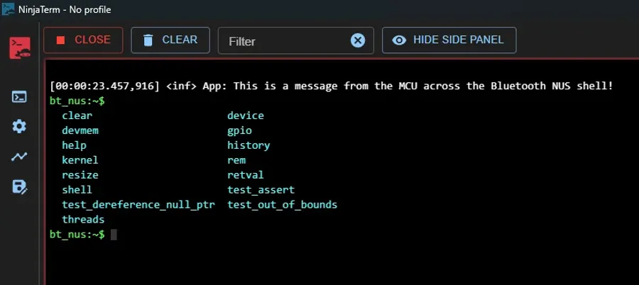 If you want to connect to this Bluetooth NUS shell peripheral from a computer, you can use the NinjaTerm terminal application. This supports Bluetooth LE as a connection type, and can auto-detect and listen to the popular Bluetooth serial service and characteristic UUIDs such as the Nordic UART Service (NUS).