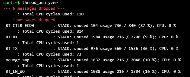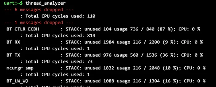 Zephyr implements a character based circular buffer for storing messages to be processed (remember — Zephyr logging is typically done asynchronously). If other threads create logs too quickly for the log thread to process, at some point Zephyr will drop logs. You will typically see a log error generated when this happens stating --- x messages dropped --- (as shown below).