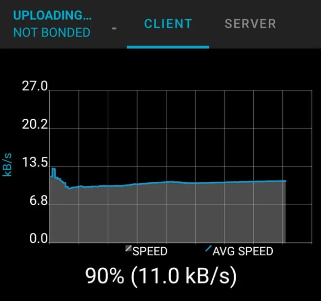 If bootloading via Bluetooth, don’t expect speeds greater than about 4-10 kB/s when uploading new firmware. This is a placeholder for the reference: fig-transfer-speeds-of-dfu-over-bluetooth shows the transfer speeds I managed to achieve over Bluetooth. It takes about 30-60 seconds to transfer the entire application image which was in the 200-400 kB range.