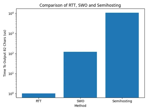 This is a placeholder for the reference: fig-comparison-of-rtt-swo-and-semihosting shows the speeds of outputting 82 characters from a MCU to a host computer using RTT, SWO and semihosting (semihosting is when the target CPU is halted and put under control of the debug host for a period of time to perform some action, e.g. read memory). Note the logarithmic y-axis!