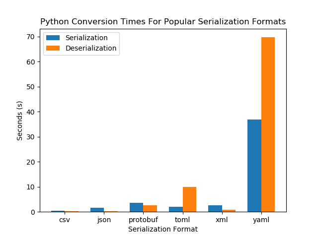 Being the only binary, non-human readable format that was compared, it’s with no surprise that protobuf is the most concise format. Closely behind protobuf was CSV. Because CSV does not support irregular, non-flat data structures, it only requires a value delimiter (e.g. ,) and end of line character (e.g. \n).