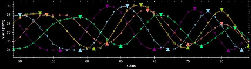 The following image shows maxima/minima detection for six noisy, sine-like waveforms.