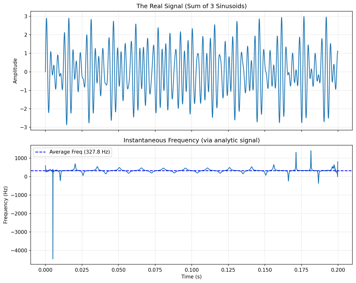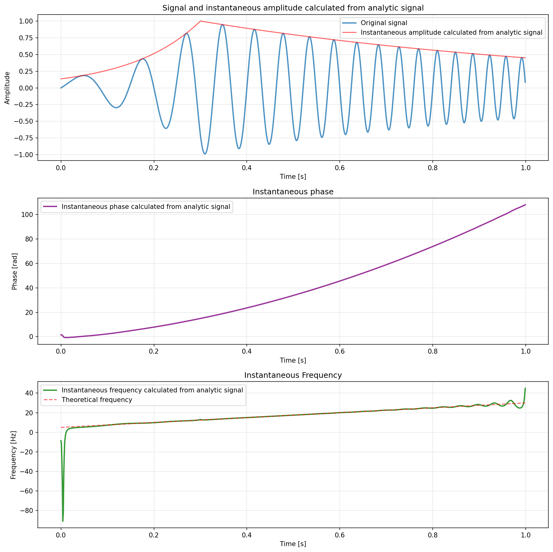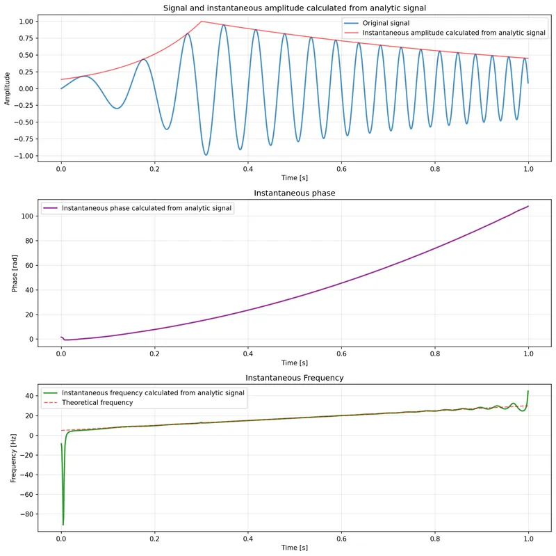 You can see how the instantaneous amplitude calculated from the analytic signal closely follows the original amplitude envelope and how it can be a useful way to demodulate amplitude modulated signals. Also useful is the calculated instantaneous phase and frequency. Note how the calculated instantaneous frequency closely matches the theoretical frequency is used to create the chirp in the first place, except for just after .