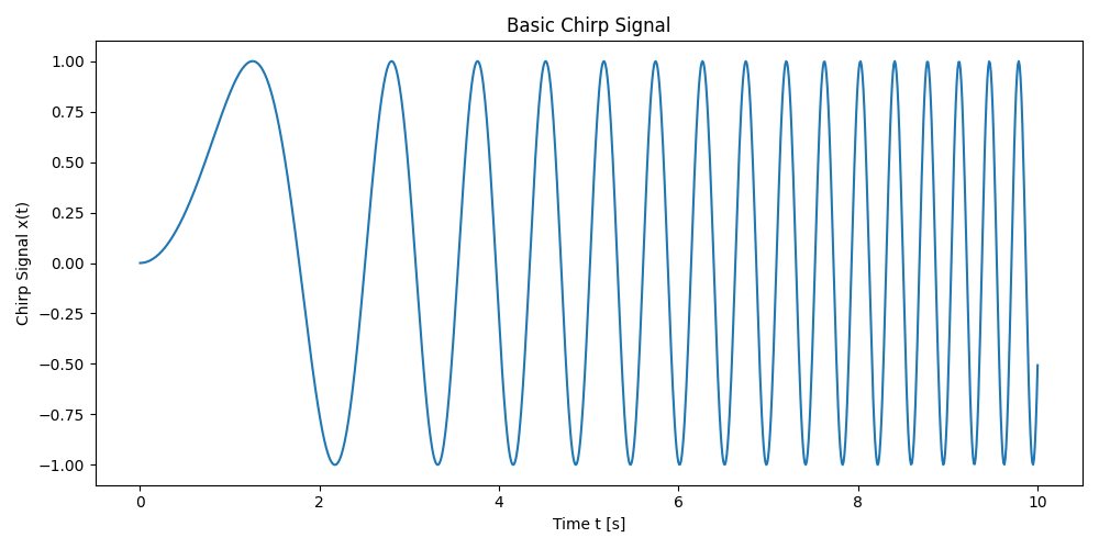 The simplest chirp signal can be created by squaring the time variable in a normal sinusoidal signal, for example: