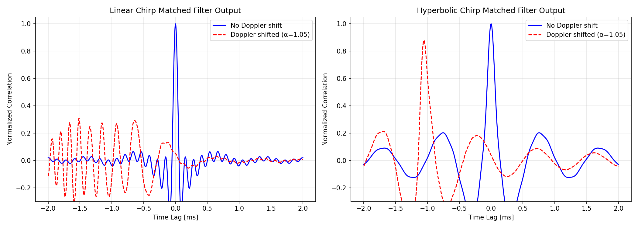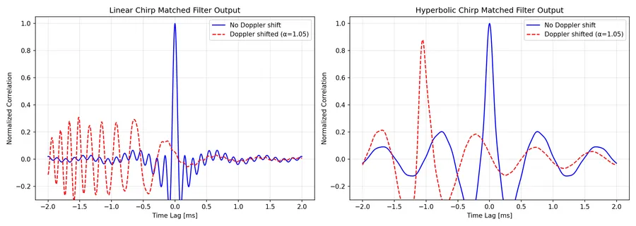 This is a placeholder for the reference: fig-doppler-matched-filter-comparison shows a side-by-side comparison of matched filter outputs for linear and hyperbolic chirps, both with and without Doppler shift (, representing approximately 5% time compression). The negative time lag for the peaks in the doppler shifted waveforms is due to the signal being compressed in time — the received signal “finishes early” and the correlation maximum shift to where the compressed signal best aligns with the original.