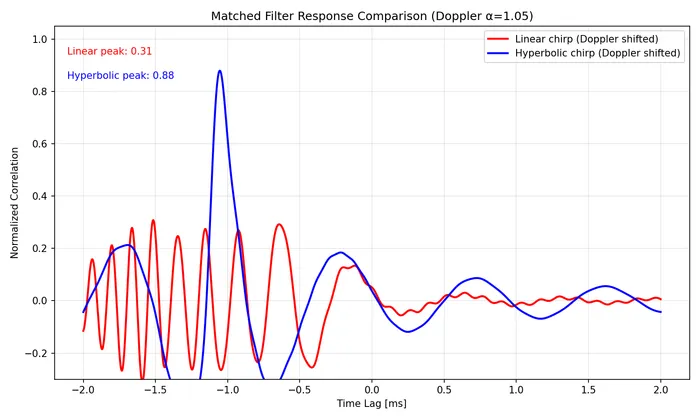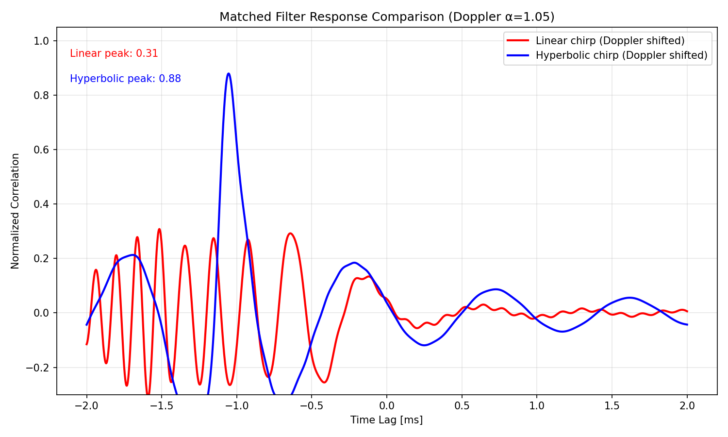 Hyperbolic chirps have a special property: when time-scaled, they are equivalent to a time-shifted version of the original signal. This means the Doppler-shifted signal still correlates well with the original (just with a shifted started point), maintaining a sharp peak in the matched filter output.