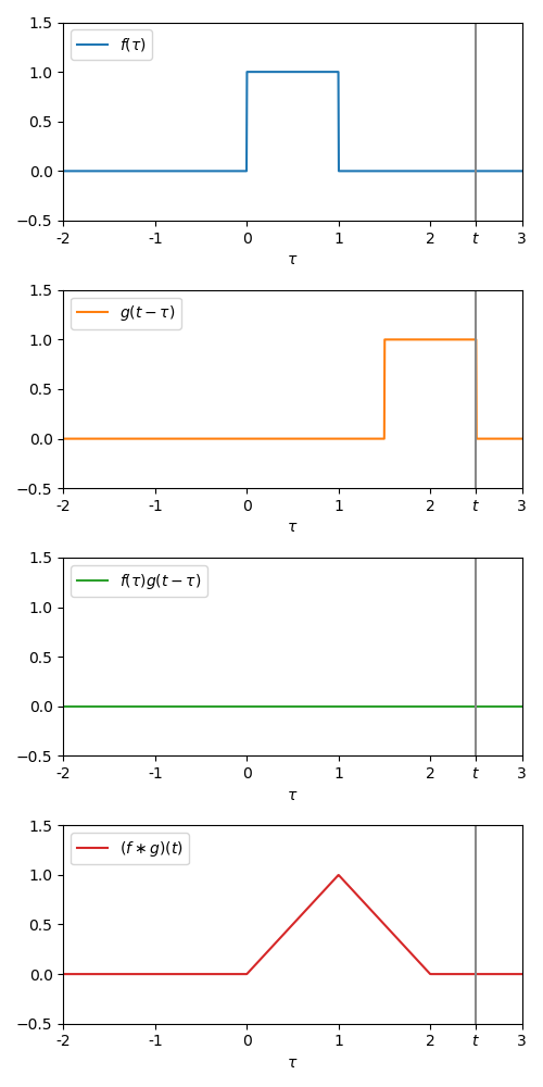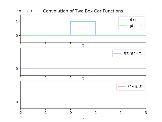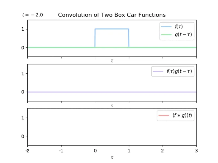 Obviously, varying from to manually is impossible, but we can break this problem down into sections, and calculate the equation for the convolution function for each section. Because box-car functions are not continuous, we need to break the problem down into sections were each section can describe the convolution in a continuous form.