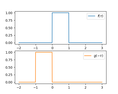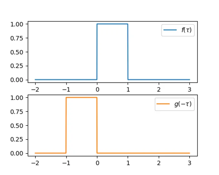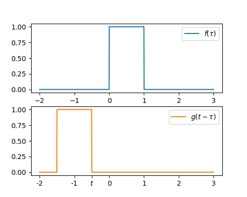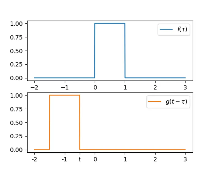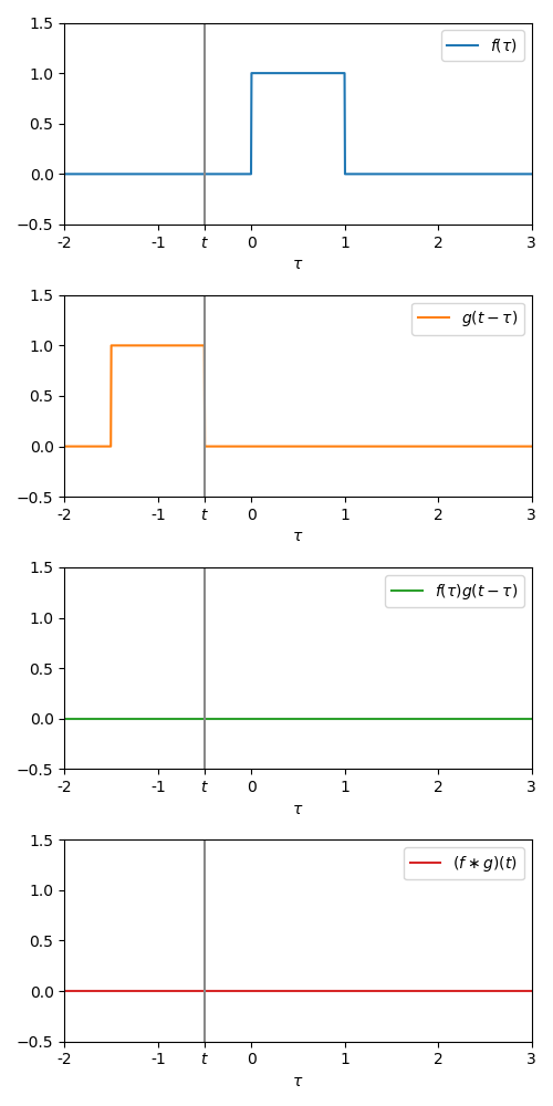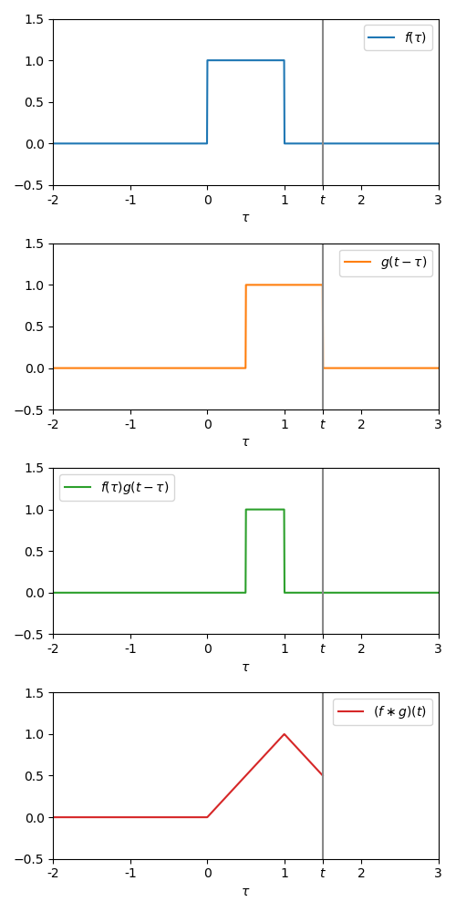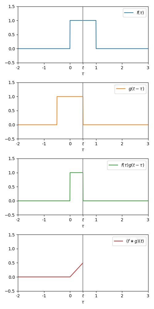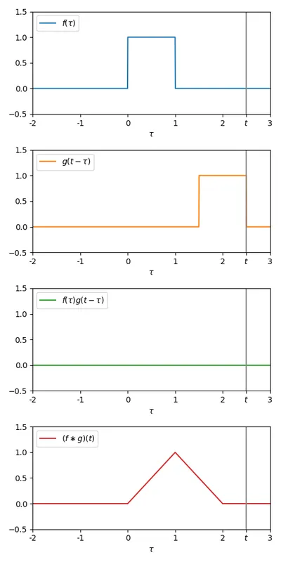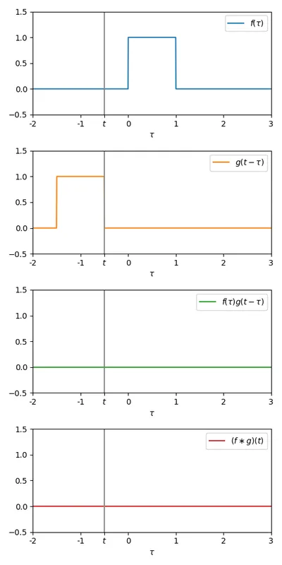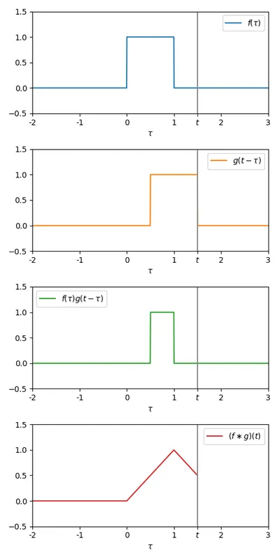 Now we to vary from to , and at each , multiply the two signals together , and calculate the total area under this new signal (mathematically, the integral between and ). This area is the value of the convolution at time .