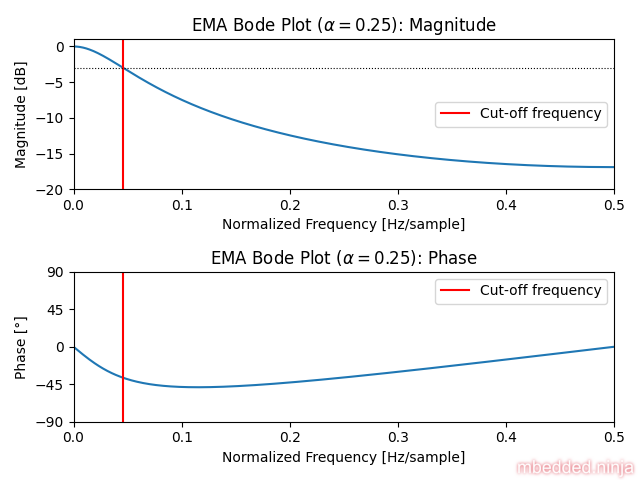 This transfer function can be used to create bode plots of the magnitude and phase response of the EMA filter. The below bode plot shows the response of an EMA filter with . The x-axis frequency is the normalized frequency, in units , which makes the plot applicable for any sampling frequency.