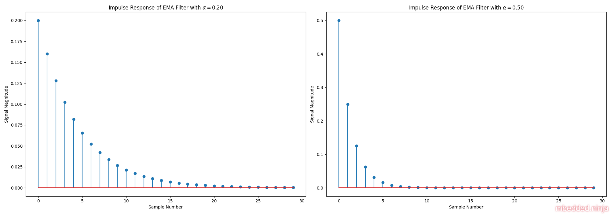 From this, we can plot what the response will look like for impulse as the input. As you can see in the following graph, the output starts off at and then decays towards 0. A larger alpha makes the initial response larger but also the decay faster.
