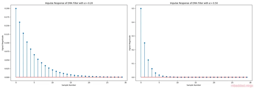 The frequency response of the EMA filter can be found by using the Z transform. If we start with the time-domain equation for an EMA filter: