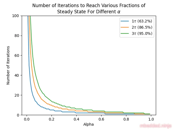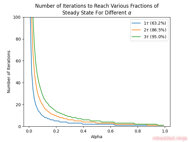 Related to the frequency response and the impulse response, you can define a time constant for the EMA filter. The time constant is the time it takes for the output to reach (63.2%) of the steady state value. This is a placeholder for the reference: fig-ema-time-constant shows the number of iterations required to reach a given fraction of steady state for different values. This is assuming a step change in the input from 0 to 1 at .