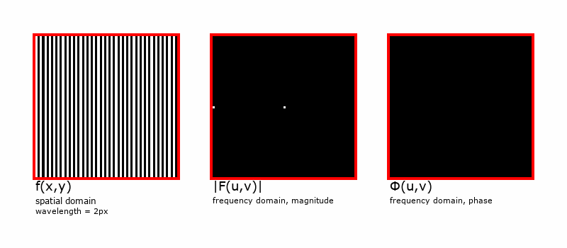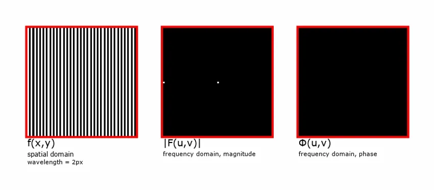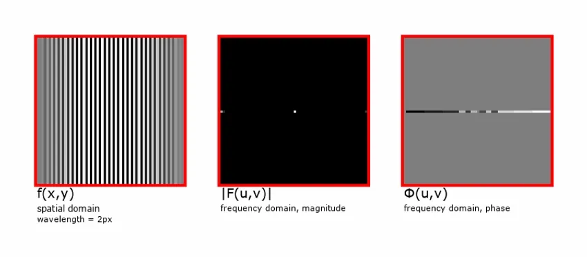 The Fourier Transform of a real-numbered spatial image (i.e. a typical photo) produces a complex-valued image in the frequency domain. Obviously, we can’t view an image made of complex numbers. What we can do is display the frequency domain image as two images, either: