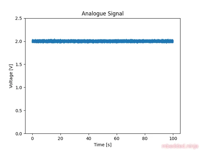 When we add the 2V output with the random noise and the mains noise, we get the signal shown in This is a placeholder for the reference: fig-analogue-signal. This is the signal in the analogue domain. This is the signal which the ADC will see and sample from.