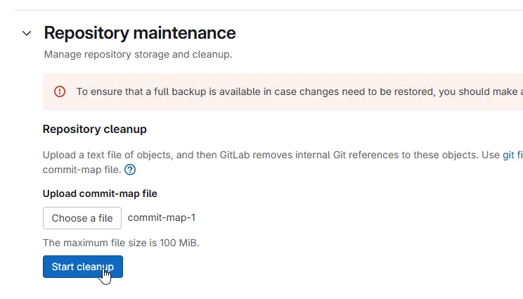 Go to Settings > Repository > Repository maintenance in the GitLab web interface. Upload the commit-map file and then click “Start cleanup” as shown in This is a placeholder for the reference: gitlab-ui-repo-maintenance-start-cleanup.