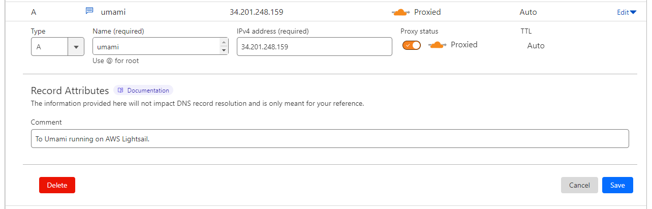 Now you need to create a DNS A Record that points your subdomain umami.my-domain.com to the IP address of the Lightsail instance you just created.
