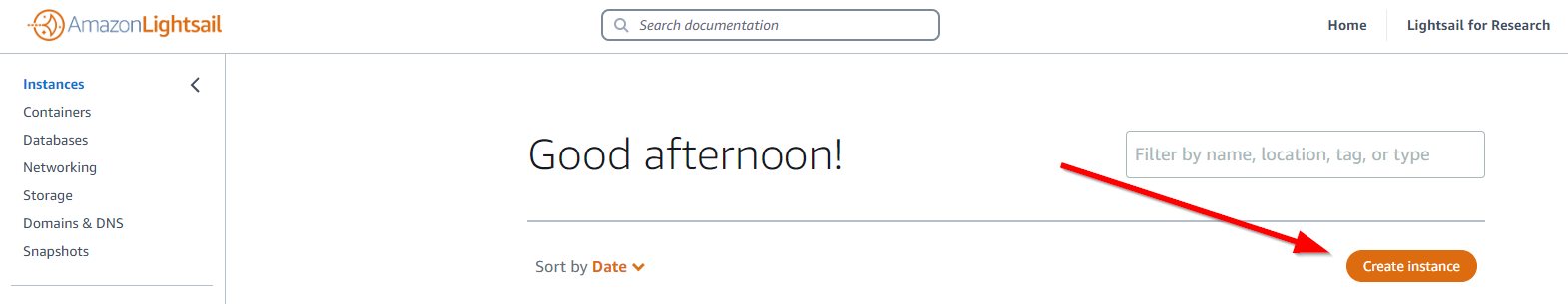 This assumes you have an AWS account. If you don’t, go and sign up now! Then log into the AWS Console, and click on Services -> Amazon Lightsail. Click the “Create instance” button as shown below: