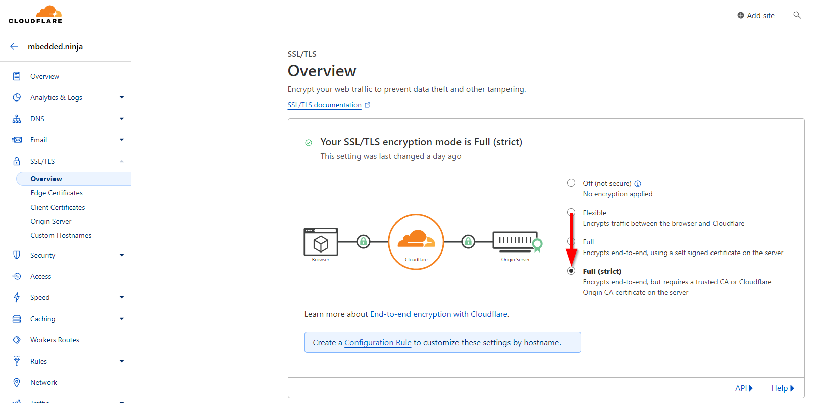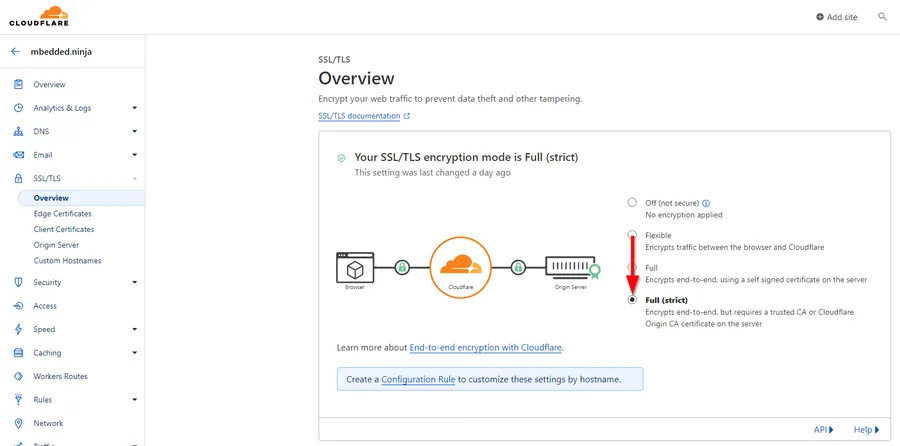 My Cloudflare account defaulted to the SSL/TLS encryption mode set to “Flexible”. As soon as I ran the Let’s Encrypt step above, I couldn’t get access to Umami through https due to a “Too many redirects” error. To fix this, I had to go to the Cloudflare dashboard, click on SSL/TLS -> Overview and change the Encryption mode from “Flexible” to “Full (strict)” as shown below: