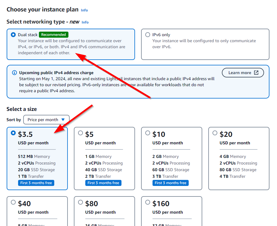 Select the Networking Type. As of March 2024, Amazon is about to charge more for servers that have IPv4 addresses. IPv6 only should work fine — except that IPv6 doesn’t work for cloning projects of GitHub, nor some docker-based commands which fetch data from remotes. What we can do though is perform all of the setup with a public IPv4 address, and then once we are complete, create a Snapshot, and create a new instance from the Snapshot that is IPv6 only. So let’s continue with an instance which has both an IPv4 and IPv6 address — select Dual stack for the Networking Type as shown below.