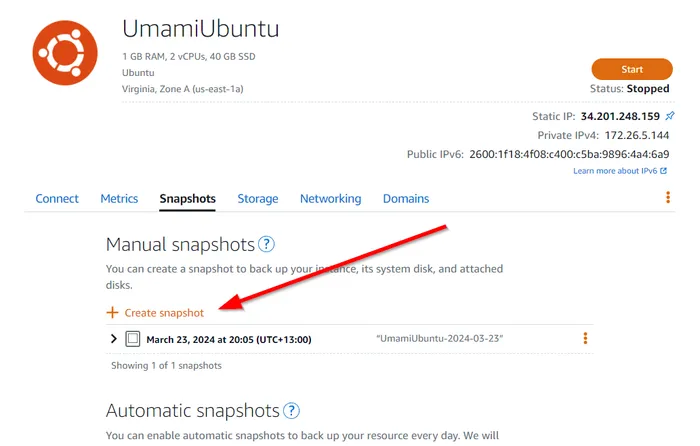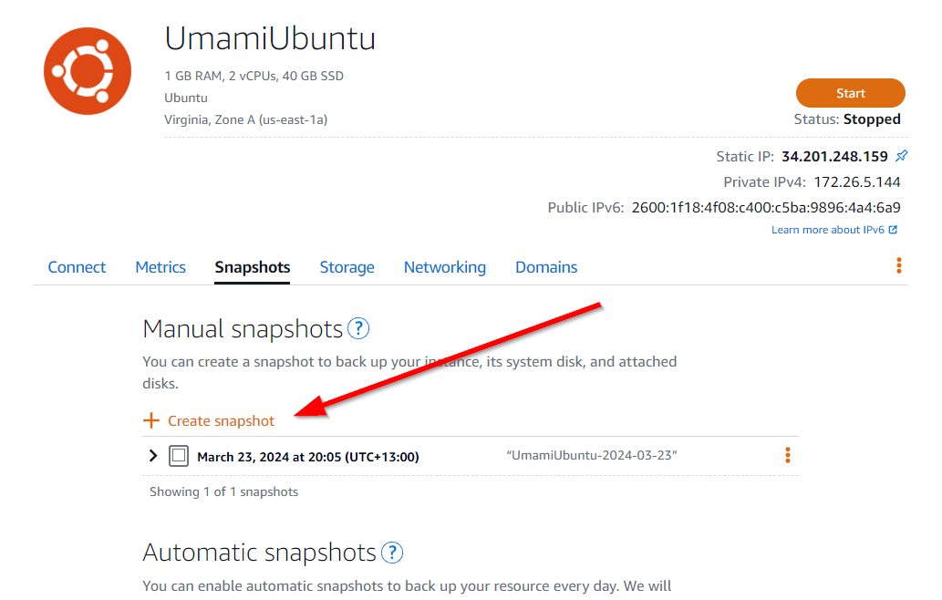 First, create a snapshot of the existing server in AWS Lightsail as shown below:
