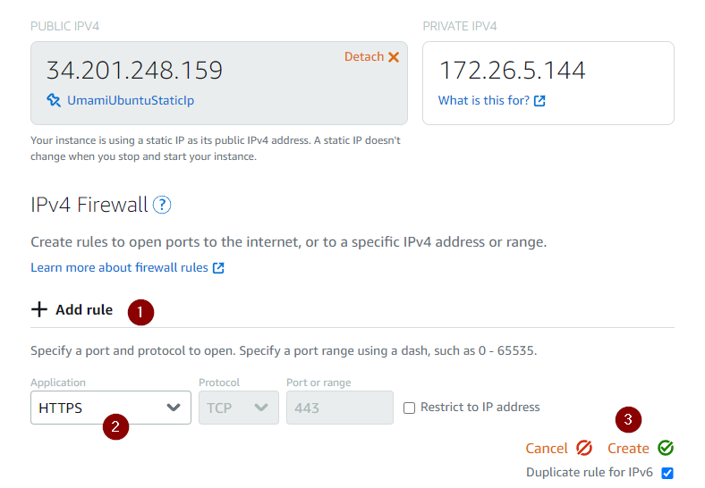 Choose an instance name to easily identify this Lightsail instance in the future, e.g. Umami-Ubuntu-IPv4-1GB. It’s completely up to you and what you want to call it.