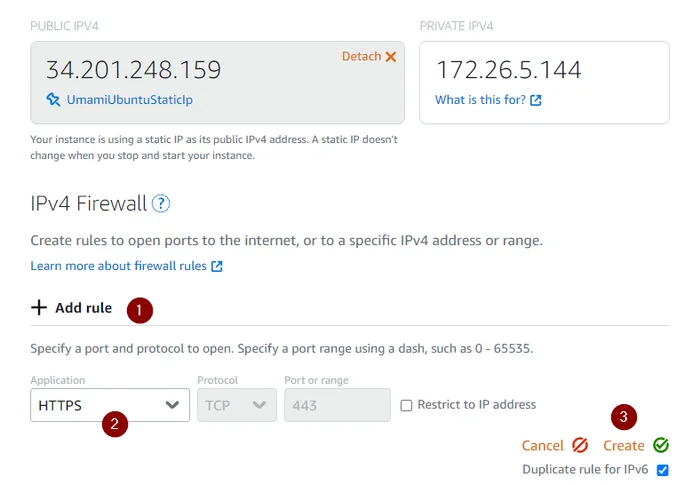 Once your Lightsail instance has spun up, click on the `Networking” tab under your Lightsail instance, and then add a IPv4 firewall rule allowing https traffic as shown below: