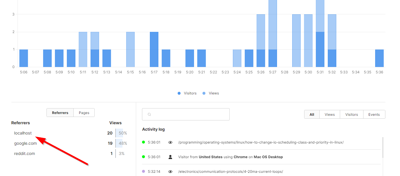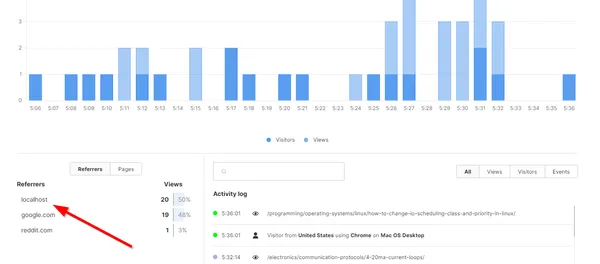 Another thing that is worth mentioning is that you probably want to disable the script when developing your site/web application locally. If you don’t, you’ll likely end up with many false hits being recorded in Umami. This is especially true with hot-reloading systems which refresh the page every time you save the source code.