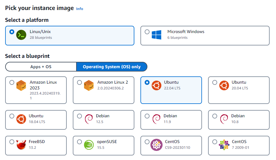 Then under “Select a blueprint”, click “Operating System (OS) only”. Select Ubuntu 22.04 as shown in below. You could choose a different Linux OS, like AWS Linux, but the commands will be different (e.g. you’ll have to use yum instead of apt) and the nginx config files structure won’t be setup to use sites-available/sites-enabled (slightly different ways of doing things).