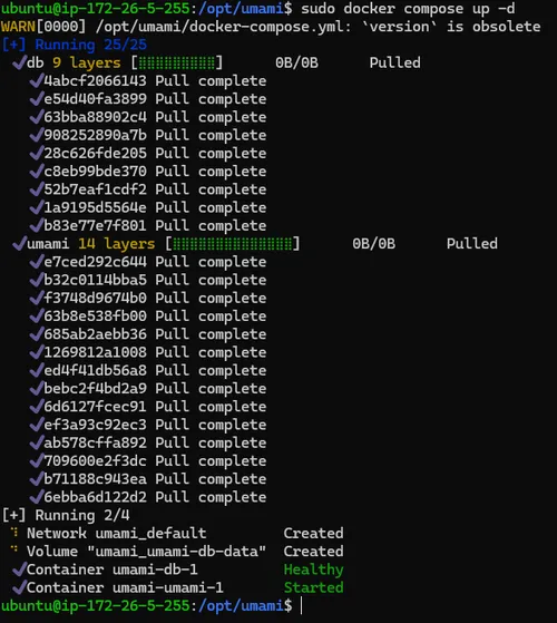 Now that Docker is installed (along with the subcommand docker compose), we should be able to start the Umami application. Run the following command:
