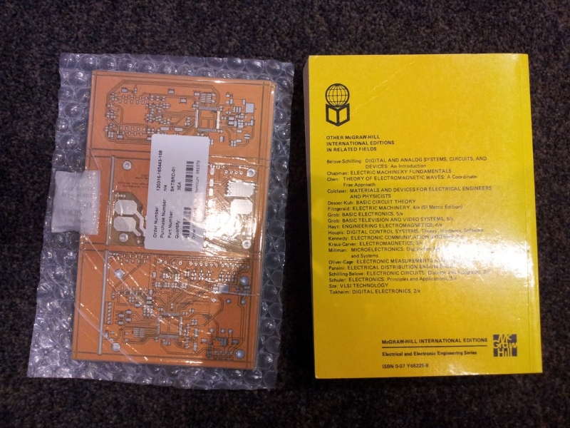 The Electric Skateboards arrived today from PCB Cart. The first thing I noticed is that the yellow soldermask I asked for was not yellow at all, but rather what can only be described as a dark spew orange. I was kind of disappointed about this, since I was hoping for a bright yellow that would match the colour of the pacman on the PCB. Also was the problem that the text on the remote PCB did not stand-out well against the dark orange, and it would be hard to read the user interface. I sent PCB Cart an email with a photo showing the colour, and they replied saying that it was the colour that they always used for yellow, and no one had complained about it before.